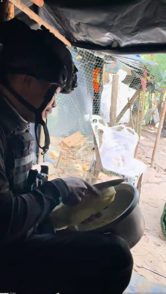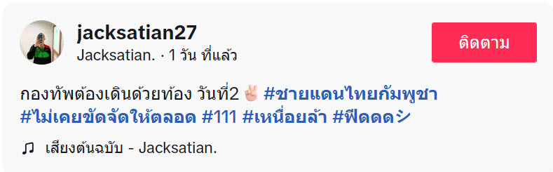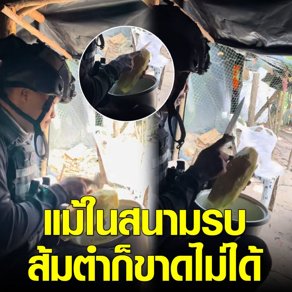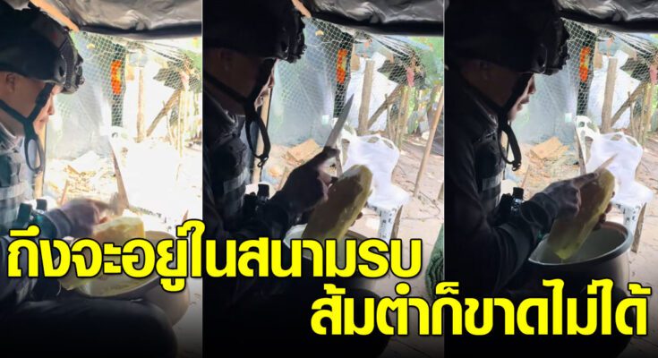 ล่าสุด ทางด้านผู้ใช้ TikTok @jacksatian27 ได้โพสต์วิดีโอคลิปทหารไทยที่อยู่แนวหน้าชายแดนไทยกัมพูชา สถานการณ์รบกันอย่างตึงเครียด แต่กองทัพก็ต้องเดินด้วยท้อง เมนูที่ขาดไม่ได้เลยก็คือ ส้มตำ อะไรก็สู้ส้มตำไม่ได้ กำลังเร่งสับมะละกออยู่ ทำเอาชาวเน็ตเอ็นดู โดยได้โพสต์ระบุว่า…