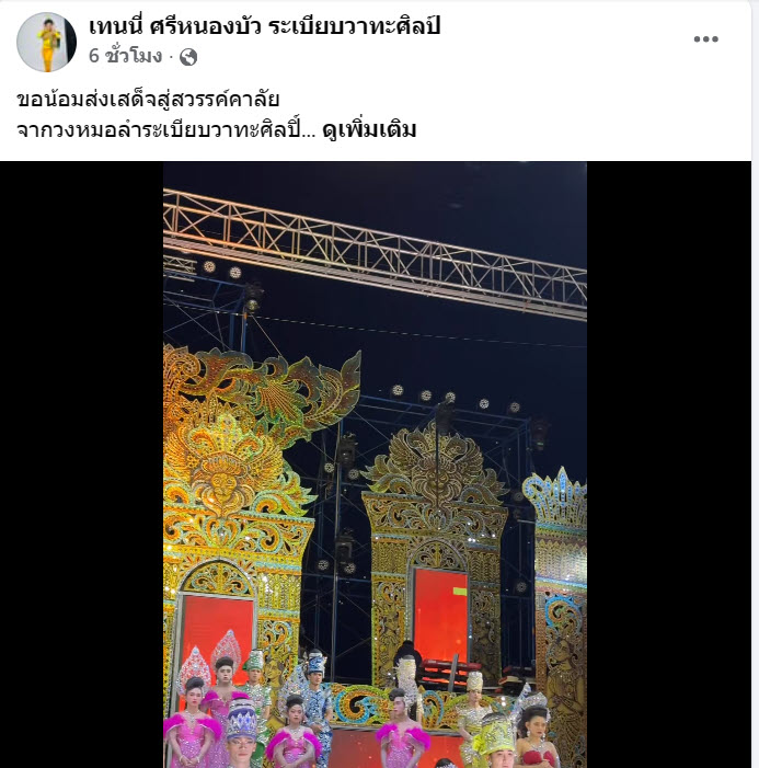 ล่าสุด ทางด้านเฟสบุ๊ก เทนนี่ ศรีหนองบัว ระเบียบวาทะศิลป์ ได้โพสต์สมาชิกหมอลำระเบียบวาทะศิลปิ์ที่ได้ทำการแสดงจนถึงเช้ามืดวันที่ 25 ตุลาคม 2568 ได้ทราบข่าวสมเด็จพระนางเจ้าสิริกิติ์ พระบรมราชินีนาถ พระบรมราชชนนีพันปีหลวง เสด็จสวรรคต ได้ร่วมกันยืนสงบนิ่งไว้อาลัย เสด็จสู่สวรรค์คาลัย พร้อมเพียงกัน โดยได้โพสต์ระบุว่า…