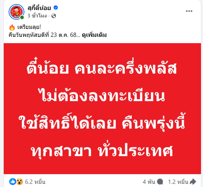 คืนวันพฤหัสบดีที่ 23 ตุลาคม 2568 เวลา 23.00 – 05.00 น. สุกี้ตี๋น้อยจัดโปรโมชั่น ลดราคา 50% ทุกสาขาทั่วประเทศ โดยราคาบุฟเฟต์เพียง บุฟเฟต์ 110 บาท รีฟิล 39 บาท ภาษีมูลค่าเพิ่ม (VAT) 7% รวมแล้วจ่ายเพียง 159 บาทต่อคนเท่านั้น