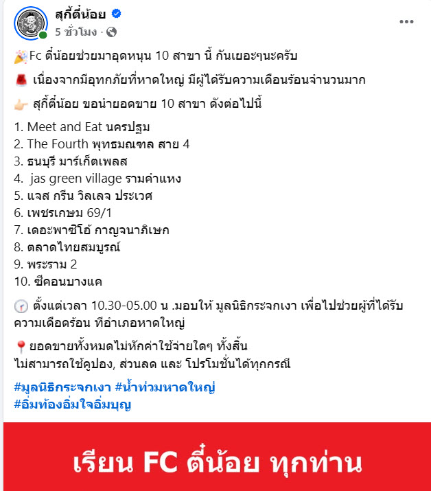 Fc ตี๋น้อยช่วยมาอุดหนุน 10 สาขา นี้ กันเยอะๆนะครับ เนื่องจากมีอุทกภัยที่หาดใหญ่ มีผู้ได้รับความเดือนร้อนจำนวนมาก สุกี้ตี๋น้อย ขอนำยอดขาย 10 สาขา ดังต่อไปนี้