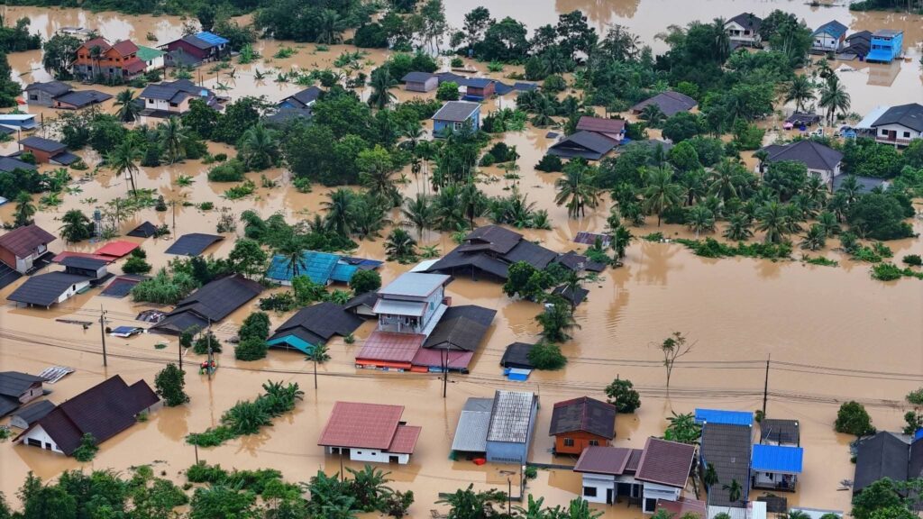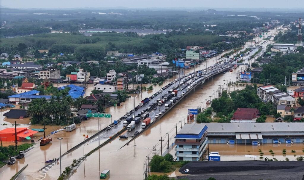 อำเภอหาดใหญ่ จ.สงขลา กำลังเผชิญภาวะน้ำท่วมครั้งใหญ่ หลังฝนตกหนักต่อเนื่องจากอิทธิพลร่องมรสุม ส่งผลให้ปริมาณน้ำฝนสะสมสูงสุดในรอบหลายสิบปี หลายพื้นที่มีน้ำไหลหลากเข้าท่วมอย่างฉับพลัน ถนนสำคัญถูกตัดขาด บ้านเรือนจมสูงกว่า 1 เมตร บางจุดท่วมจนมิดรถยนต์ ชาวบ้านต้องเร่งอพยพขึ้นที่สูง ขณะที่ทางการประกาศเตือนภัยธงแดง ทั้ง 16 อำเภอของจังหวัดสงขลาได้รับผลกระทบแล้ว รวม 115 ตำบล 821 หมู่บ้าน 167 ชุมชน มีประชาชนได้รับผลกระทบจำนวน 243,568 ครัวเรือน รวม 635,423 คน ต้องอพยพรวม 1,224 คน และมีผู้เสียชีวิตแล้ว 1 คน