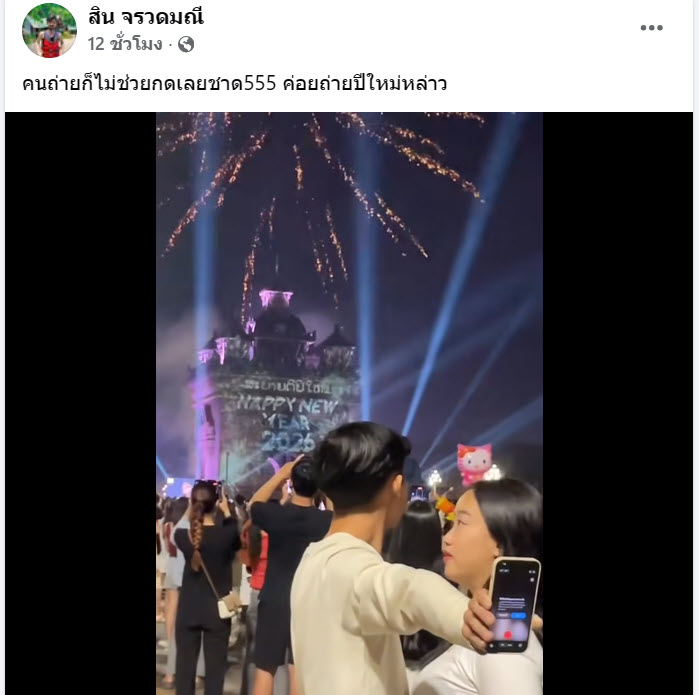 ล่าสุด ทางด้านผู้ใช้เฟสบุ๊ก สิน จรวดมณี ได้โพสต์วิดีโอคลิปวินาทีชมพลุคืนเคานต์ดาวน์ มีหนุ่มสาวคู่รักคู่หนึ่ง กำลังเตรียมถ่ายวิดีโอคลิปพลุปีใหม่ พอถึงตอนถ่ายเท่านั้นแหละ เห็นหน้าจอแล้วมันแปลกๆ นะ แอบสงสาร แต่นาทีนั้นคงไม่ทันแล้ว เกิดอะไรขึ้นนั้นตามไปดู