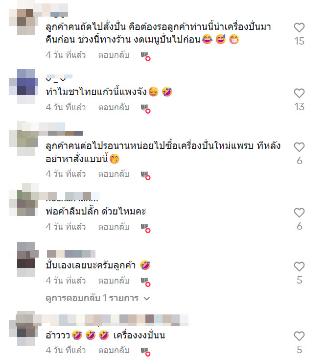 ลูกค้ากล้าสั่ง พ่อค้าก็หาสุดวิธีที่จะทำให้ ชาไทย + น้ำแข็งใส่แก้ว + เครื่องปั่น ยกไปปั่นเองที่บ้านเลย ตรงตามที่ลูกค้าสั่งเป๊ะๆ เลย ลูกค้าอึ้งคาดไม่ถึงกับสิ่งที่พ่อค้าทำให้แน่นอน ฮาๆ