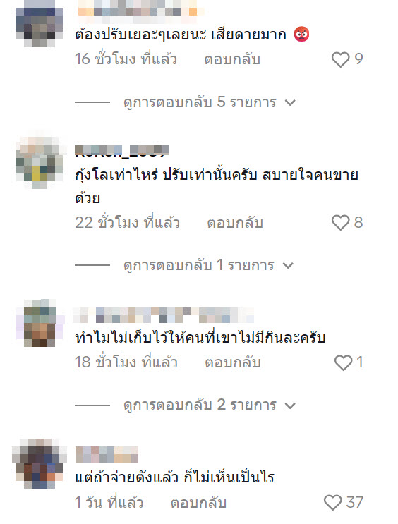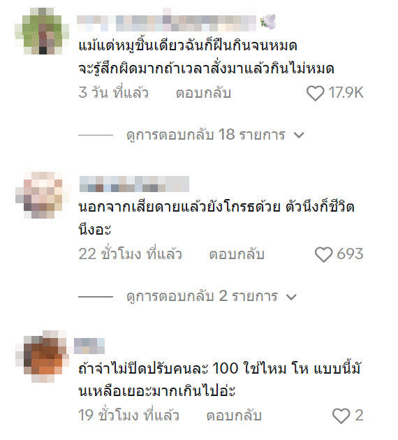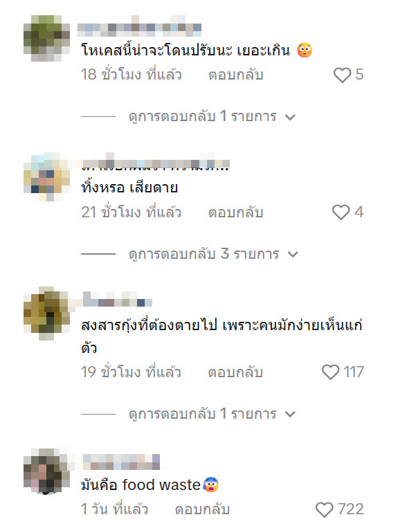 คลิปดังกล่าวทำให้ชาวเน็ตจำนวนไม่น้อยรู้สึกเสียดายอาหาร โดยเฉพาะกุ้งที่ยังดูสดและน่ากิน หลายคนตั้งข้อสงสัยว่า ทำไมทางร้านไม่อนุญาตให้นำอาหารที่กินไม่หมดกลับบ้านไปแทนการทิ้งให้กลายเป็นขยะ