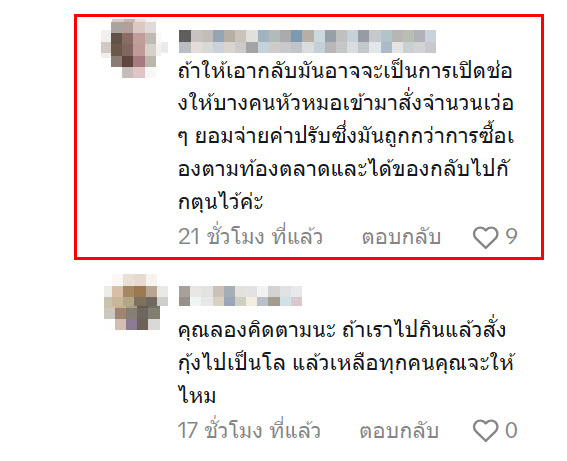 อย่างไรก็ตาม มีผู้แสดงความคิดเห็นให้มุมมองอีกด้านว่า หากเปิดโอกาสให้นำกลับบ้านได้ อาจกลายเป็นช่องโหว่ให้ลูกค้าบางรายตั้งใจสั่งอาหารจำนวนมาก ยอมจ่ายค่าปรับซึ่งอาจถูกกว่าการซื้อวัตถุดิบเองตามท้องตลาด แล้วนำอาหารกลับไปกักตุนไว้ ทำให้ระบบบุฟเฟต์เสียสมดุลและไม่เป็นธรรมกับร้าน