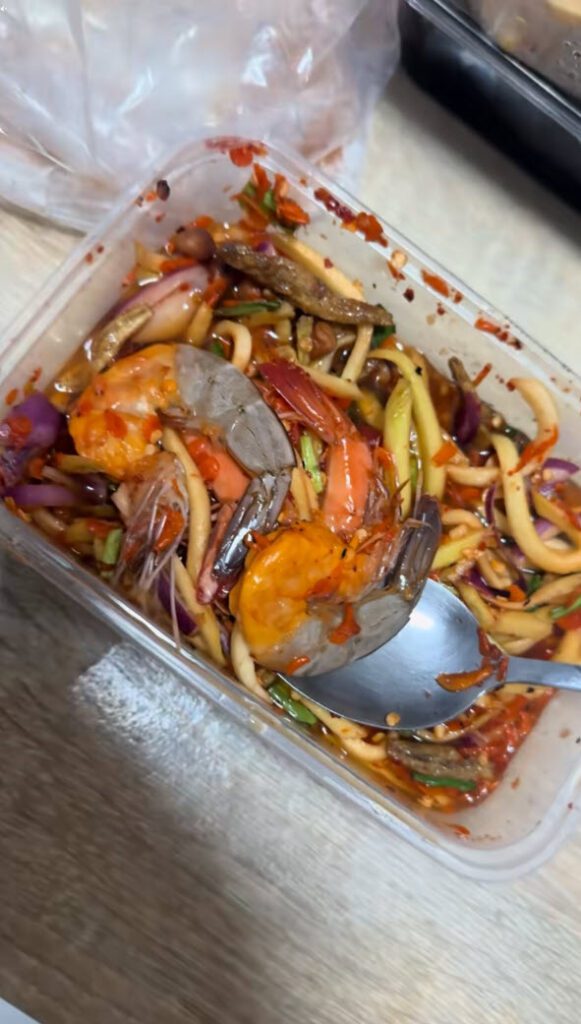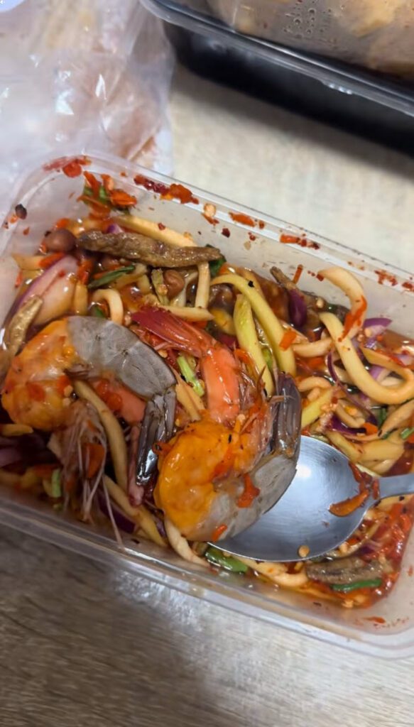 ยำมะม่วงกุ้งทูโทนของจริง ตรงปกเลย กุ้งสดครึ่ง ไม่สุกครึ่ง ก็เลยทำให้เป็นสีทูโทน งานนี้บอกเลยว่าลูกค้าเห็นแล้วถึงกับขำกลิ้ง ของจริงตรงปก