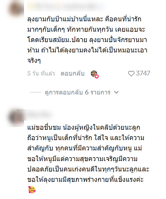 แม่ขอชื่นชม น้องผู้หญิงในคลิปด้วยนะลูก ถือว่าหนูเป็นเด็กที่น่ารัก ใส่ใจ และให้ความสำคัญกับ ทุกคนที่มีความสำคัญกับหนู แม่ขอให้หนูมีแต่ความสุขความเจริญมีความปลอดภัยเป็นคนเก่งคนดีในทุกๆวันนะลูกและขอให้ลุงยามมีสุขภาพร่างกายที่แข็งแรงค่ะ