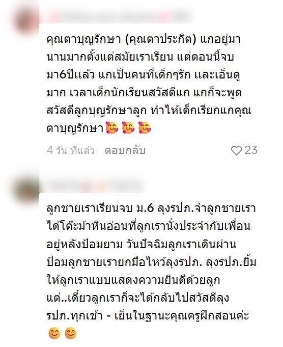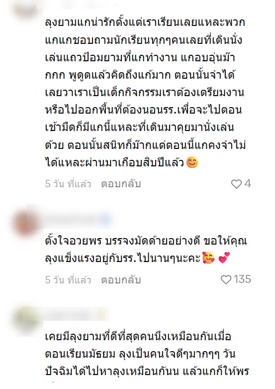 ลุงยามกับป้าแม่บ้านนี่แหละ คือคนที่น่ารักมากๆกับเด็กๆ ทักทายกันทุกวัน เคยแอบจะโดดเรียนสมัยม.ปลาย ลุงยามปั่นจักรยานมาห้าม ถ้าไม่ได้ลุงยามคงไม่ได้เป็นหมอนะเอาจริงๆ
