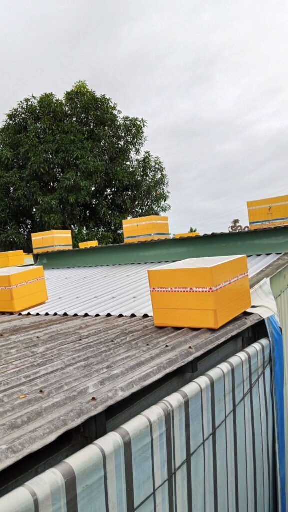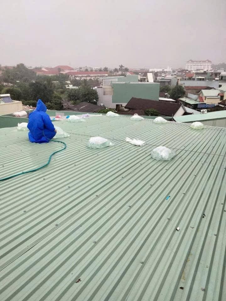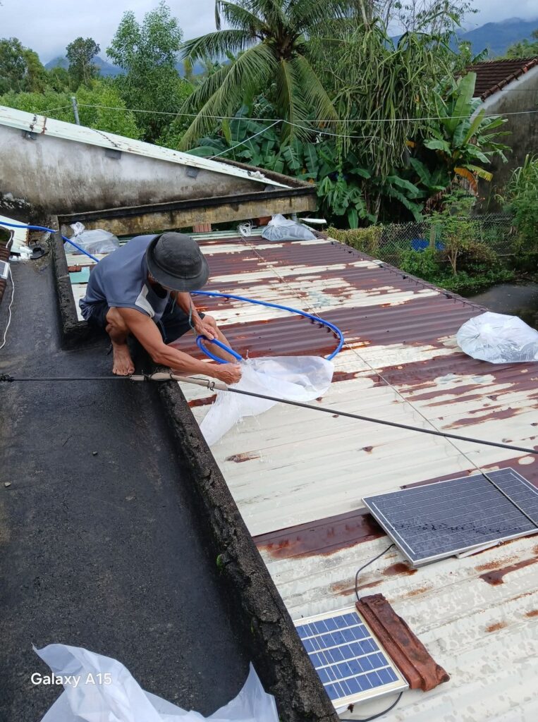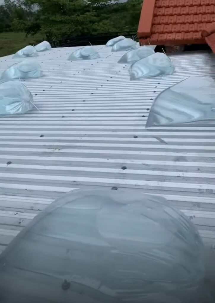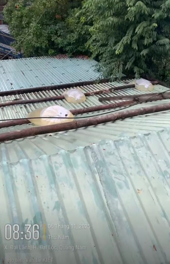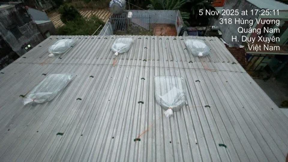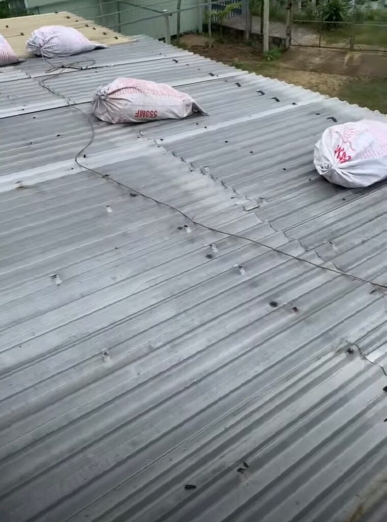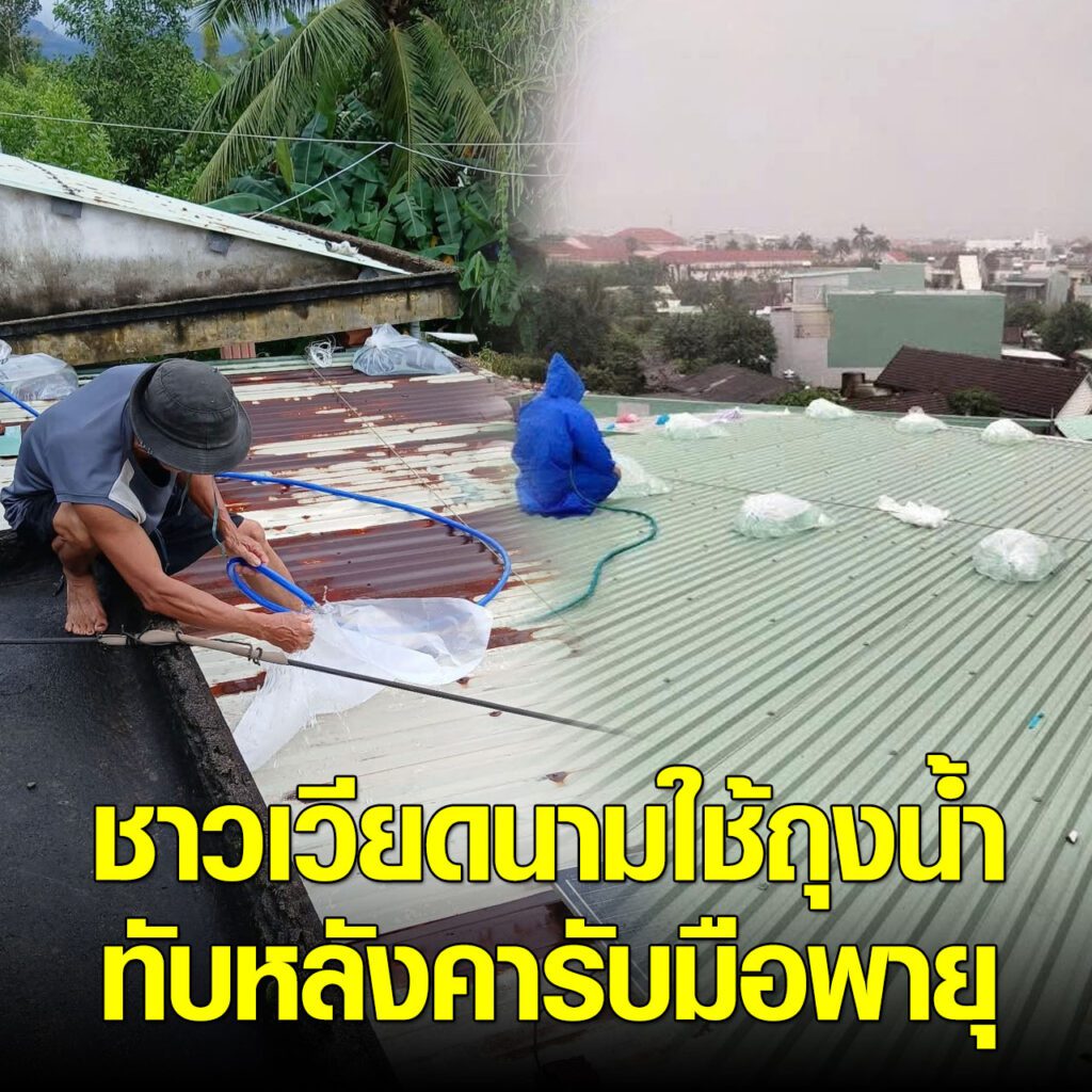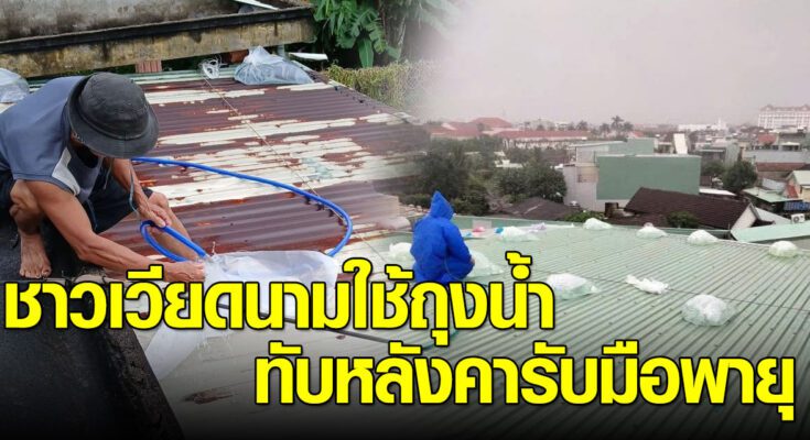 ชาวเวียดนาม เตรียมตัวรับมือพายุ คัลแมกี ภูมิปัญญาชาวเวียดนาม ป้องกัน หลังคาปลิวจากพายุ ด้วยการเพิ่มน้ำหนักหลังคา นำ ถุงน้ำ หรือ กระสอบทราย วางไว้บนหลังคา