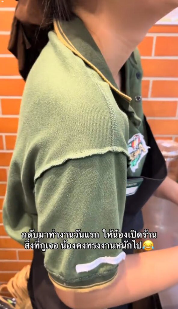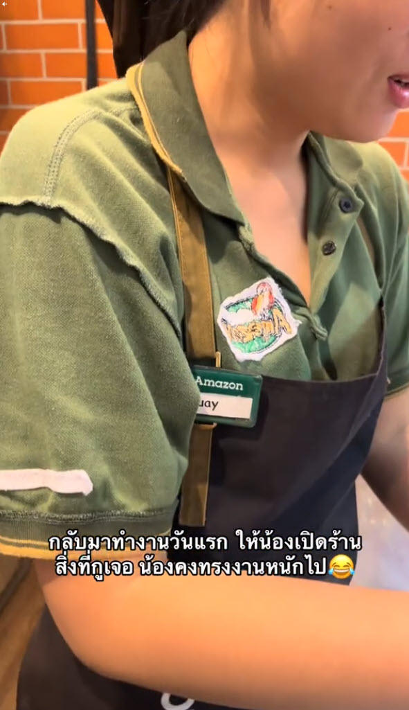เอ็นดูน้องคงจะรีบมาเปิดร้าน รับออเดอร์เยอะจนไม่ได้สังเกตเสื้อตัวเองว่าใส่กลับด้าน หัวหน้าอยู่ไหน น้องทำงานหนักเกินไปแล้ว ฮาๆ มายืนรับออเดอร์ยังไม่รู้ตัวอีก