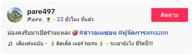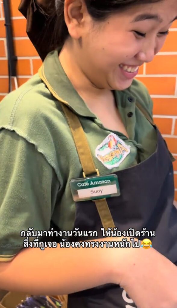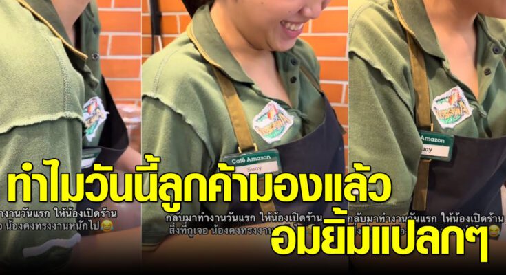 ล่าสุด ทางด้านผู้ใช้ TikTok @pare497 ได้โพสต์วิดีโอคลิปน้องพนักงานคาเฟ่อเมซอน พอเห็นเสื้อที่ใส่มาทำงานแล้วอมยิ้ม สงสัยจะรีบเมื่อเช้าจนใส่เสื้อกลับด้าน มายืนขายกาแฟหน้าร้านยังไม่รู้ตัว ลูกค้าเห็นอมยิ้มทั้งร้าน โดยได้โพสต์ระบุว่า…