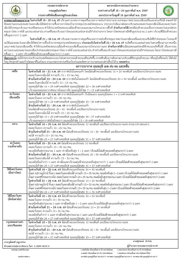 ภาคกลาง ในช่วงวันที่ 18-20 ก.พ. 69 มีฝนฟ้าคะนองร้อยละ 10 ของพื้นที่ และมีลมกระโชกแรงบางแห่ง ส่วนมากทางตอนล่าง ลมตะวันออก ความเร็ว 10-20 กม./ชม. ส่วนในช่วงวันที่ 21-24 ก.พ. 69 มีฝนฟ้าคะนองร้อยละ 10-30 ของพื้นที่ และมีลมกระโชกแรงบางแห่ง ลมใต้ ความเร็ว 10-20 กม./ชม. อุณหภูมิต่ำสุด 23-27 องศาเซลเซียส อุณหภูมิสูงสุด 31-37 องศาเซลเซียส